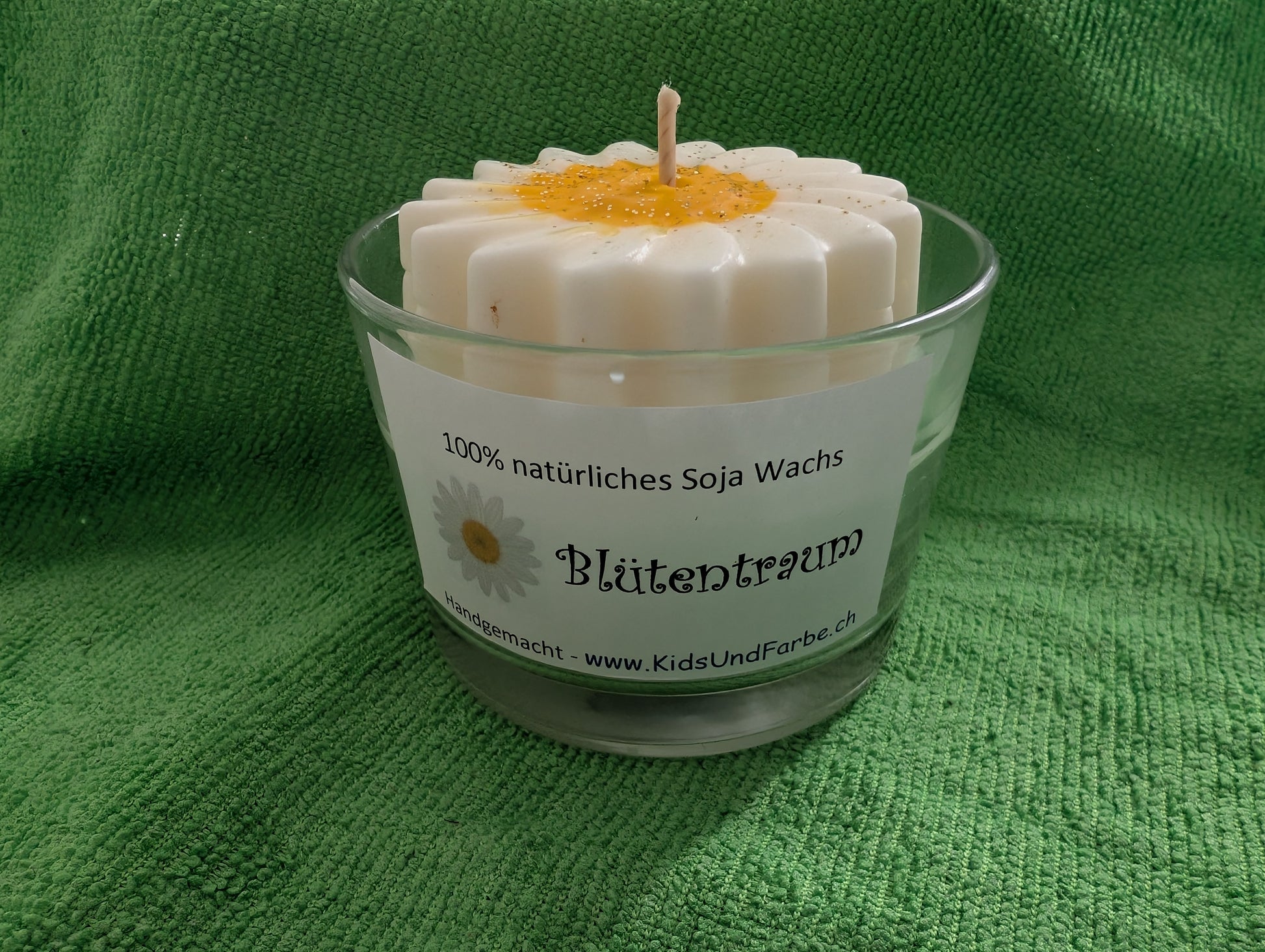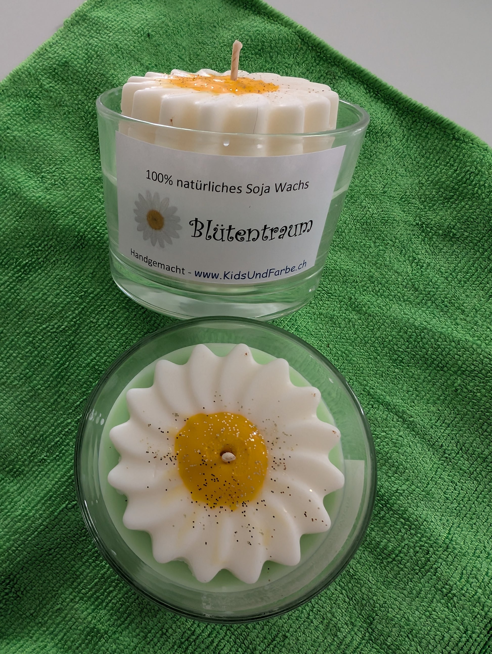 Handgemacht aus 100% Bio-Sojawachs, hochwertigem Duftöl und Baumwoll-Docht, mit etwas Glitzer.